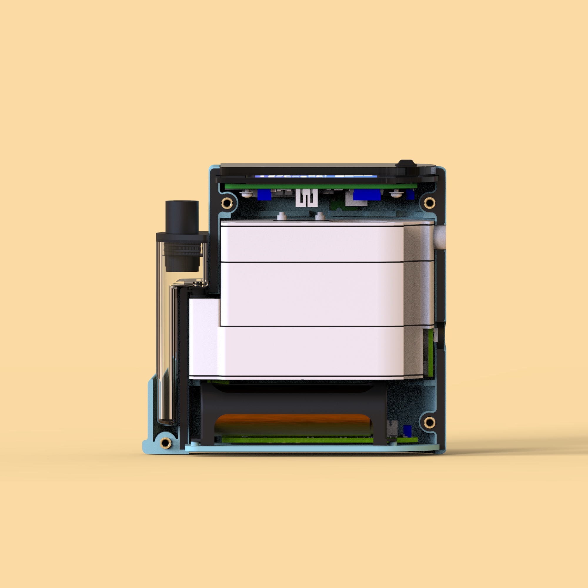 Le tout devait intégrer un écran, des boutons, une connectique de recharge et un réservoir avec un filtre pour piéger l’humidité de l’air.